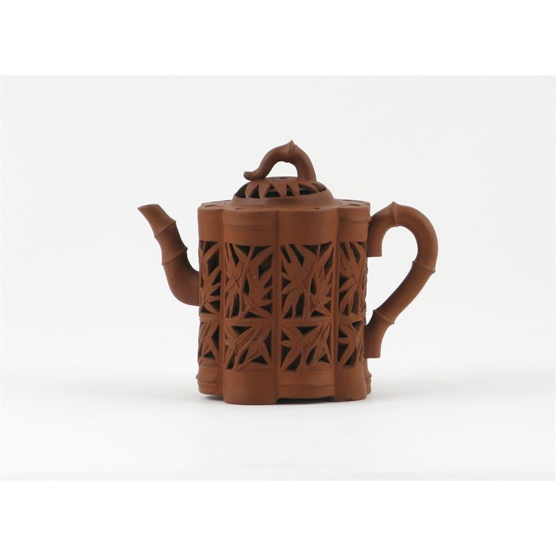 A Chinese Yixing brown stoneware teapot and cover, formed to simulated sections of bamboo, carved with an open work leaf design, the spout, handle and knop simulating further bamboo sections, 18th century, 11.5cm. (2)