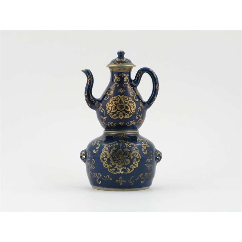 A rare Chinese wine warmer and cover, made in sections to emulate a double gourd, the upper half with a small spout and handle and with a cylindrical base decorated in iron red with five bats, the body decorated with gilt roundels and leaf scrolls on a blue ground, 18th century, some damages and repair, 19.7cm. (3)