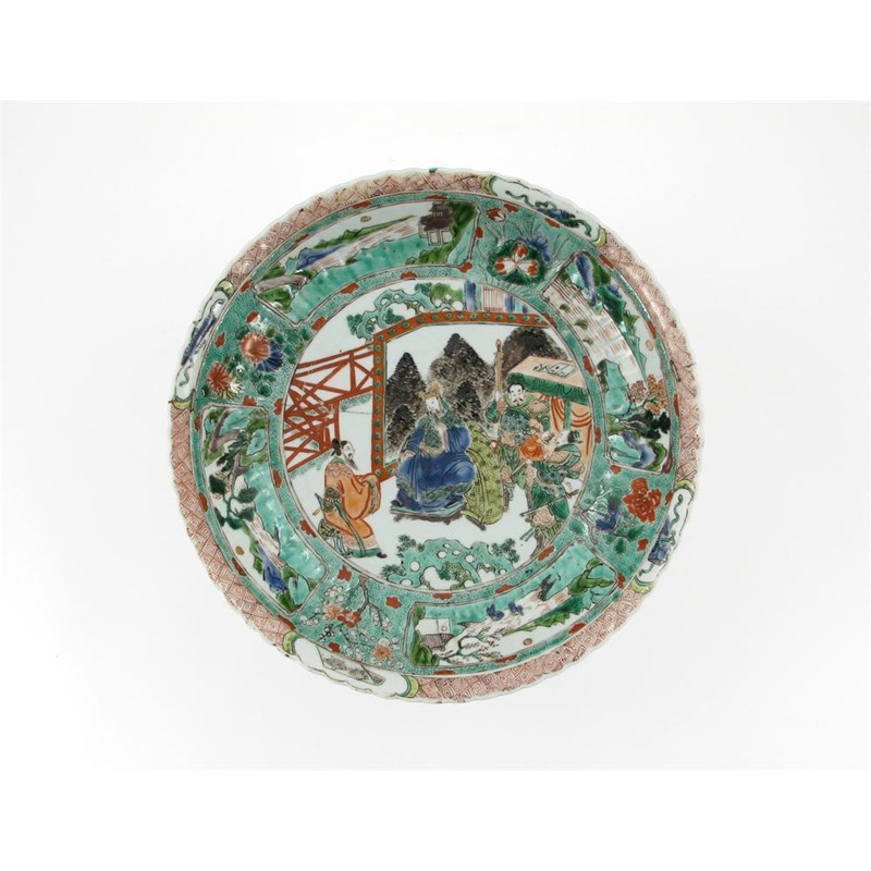 A Chinese famille verte moulded dish, painted with a dignitary seated on a terrace with attendants before a screen, the cavetto with landscape panels of a spotted green ground, an artemesia leaf mark, Kangxi 1662-1722, broken in half and repaired with rivets, 27.5cm.