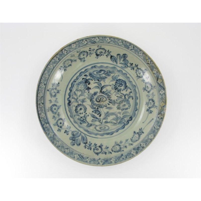 A large Chinese Swatow-type stoneware dish, painted in underglaze blue with a panel of scrolling flowers and with floral sprays to the cavetto, Fujian province late 16th / early 17th century, old restored rim chips, 41cm.