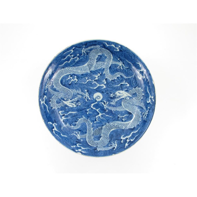 A Chinese blue and white large saucer dish, with a channel footrim, painted with two scaly four-clawed dragons contesting a flaming pearl, all reversed in white on a blue wash ground, the reverse with Buddhist emblems, an artemesia leaf mark, Kangxi 1662-1722, rim chips, 34cm dia.