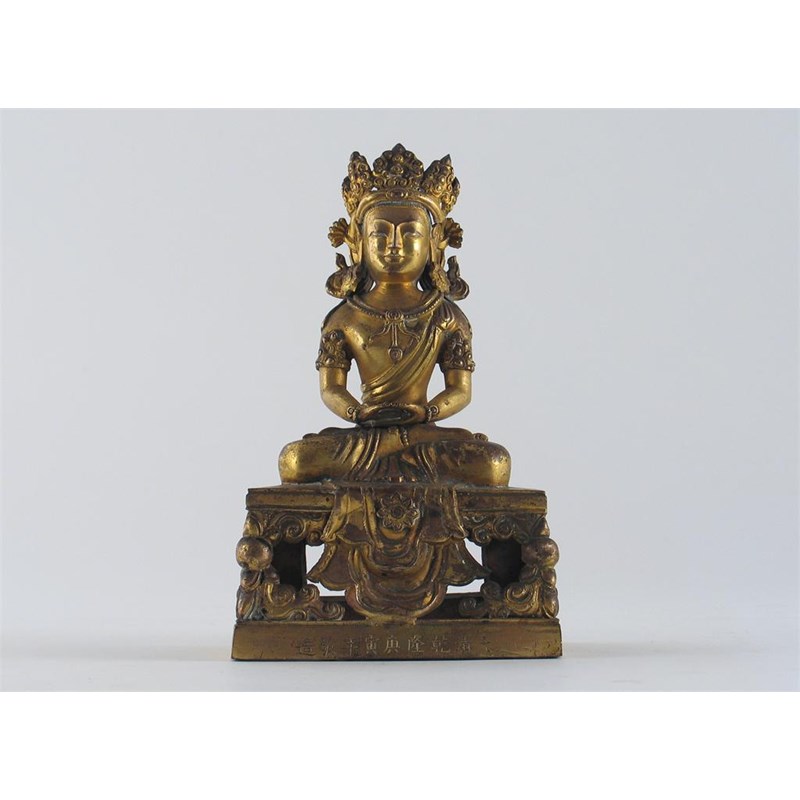 A Chinese gilt bronze figure of Buddha, seated in lalitasana mudra, on a tall rectangular stand. Nimbus missing, nine character Qianlong mark and of the period 1736-95, 19.5cm.