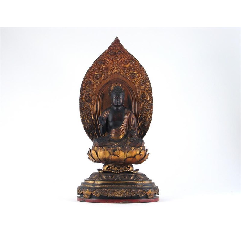 A Japanese giltwood figure of Nyorai Buddha, seated in dhyanasana mudra before a flaming mandala, raised on a high lotus throne. Some damages and wear. 19th century, 53.5cm.