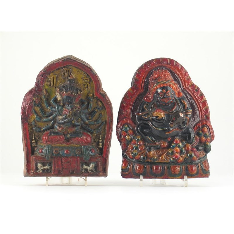 A Tibetan stoneware stele, carved with a multi-armed deity beneath three kufic characters, and a pottery stele of Kubera. Minor damage. 19th/20th century, 20cm. (2)