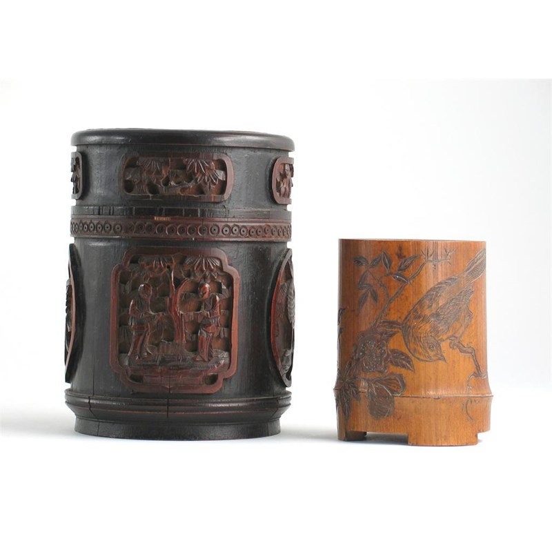 A bamboo cylindrical box and cover, carved with panels of figures, phoenix and foliage, and a bamboo brush pot, carved with a bird perched on a flowering branch, 19th century, 16.5cm. (3)