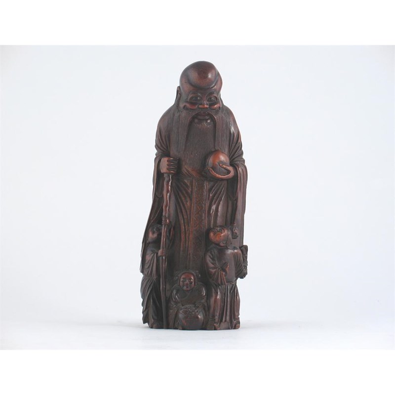 A Chinese bamboo carving of Shoulao, standing holding a peach with three attendants at his feet, 19th/20th century, 29.5cm.
