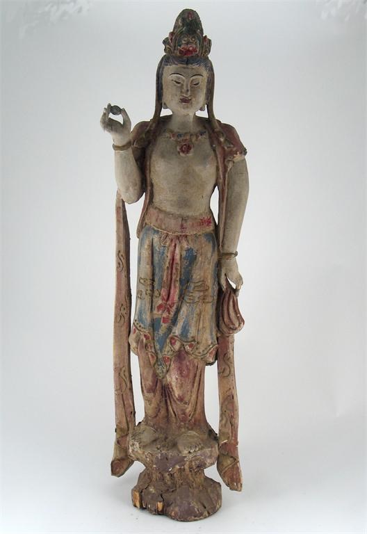 A Chinese wood carving of Guanyin, decorated with coloured pigments. Some damages. 82.5cm.