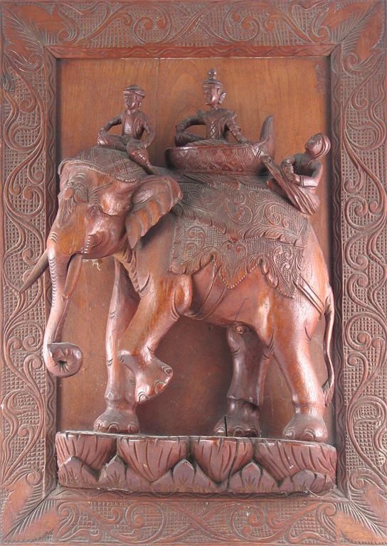 A South-East Asian carved wood panel, depicting an elephant, with three riders, 19th/20th century, 23cm.