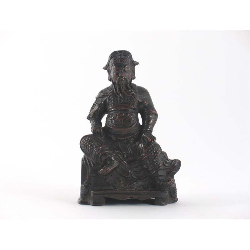 A Chinese cast coppery bronze figure of Guandi, the god of war, seated on a lion skin bedecked throne, 17th century, 15cm.