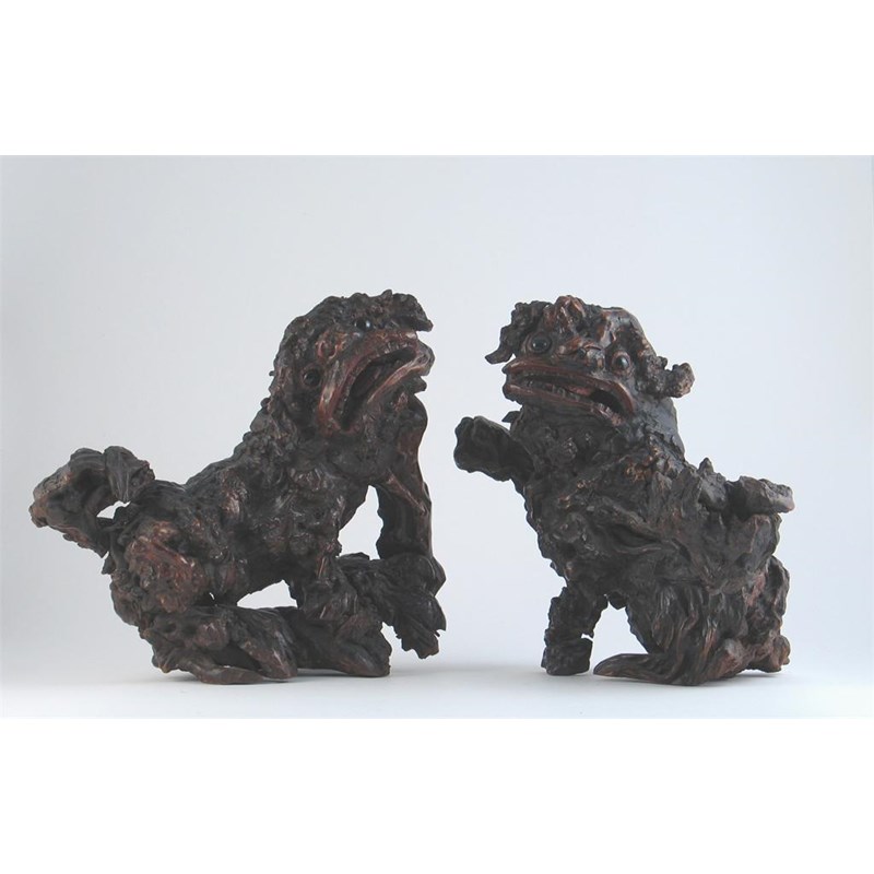 Two Chinese root-wood carvings of lion dogs, with inset stone eyes. Minor faults. 30cm. (2)
