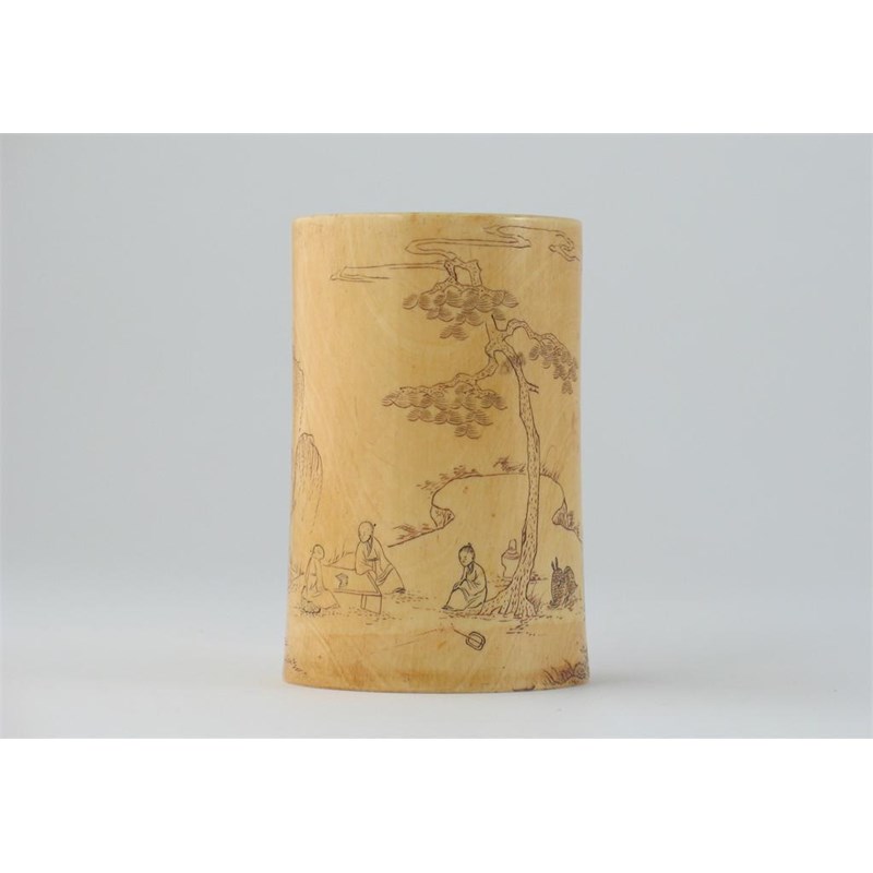 A Chinese ivory cylindrical brushpot, engraved with figures and animals at leisure in a landscape beneath pine and willow, 19th century, 9.5cm.