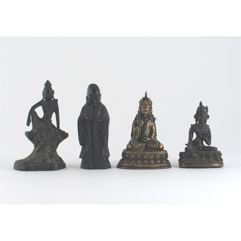 A Tibetan bronze figure of Padmasambhaua, seated in dhyanasna mudra and three further figures of green Tara, one of Avalokitesvara and a figure of Shoulao, 18th and 19th centuries, 18cm. max. (4)
