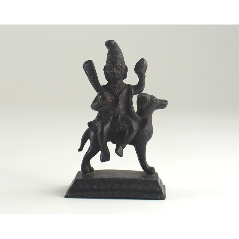 An Indian bronze figure of a man, seated on a dog, holding a skull cap in his left hand, 18th/19th century, 11cm.