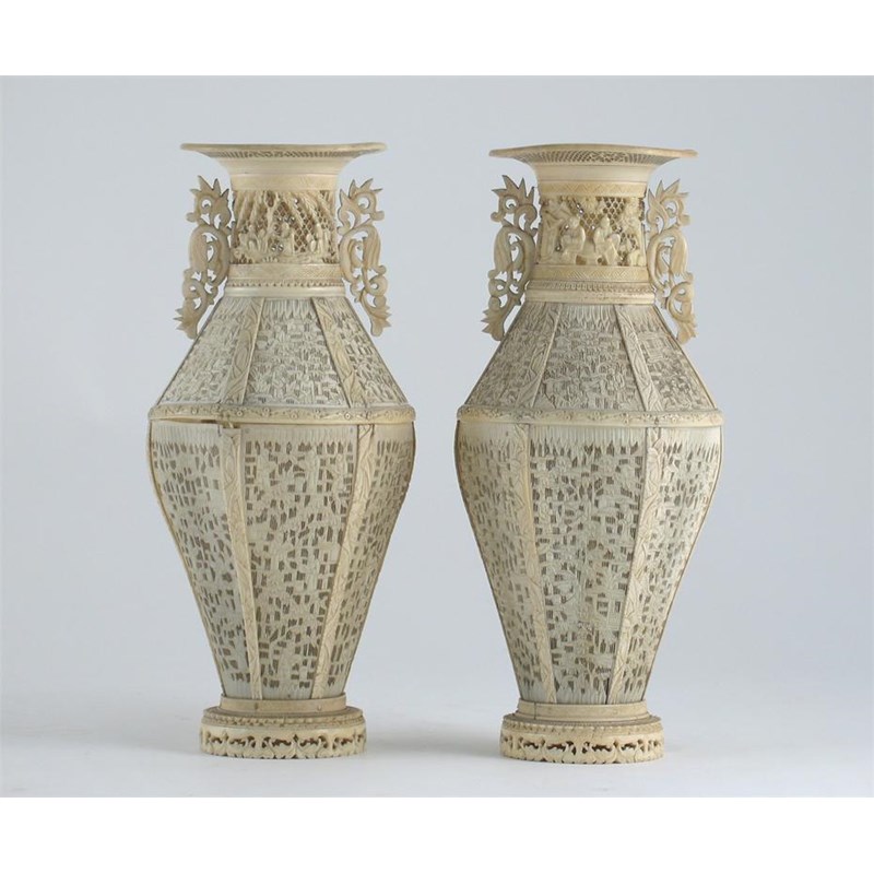 A pair of Chinese ivory vases, formed of panels carved with figures and foliage, the flared rims reticulated with a net pattern. Some damages. 19th century, 21cm. (2)