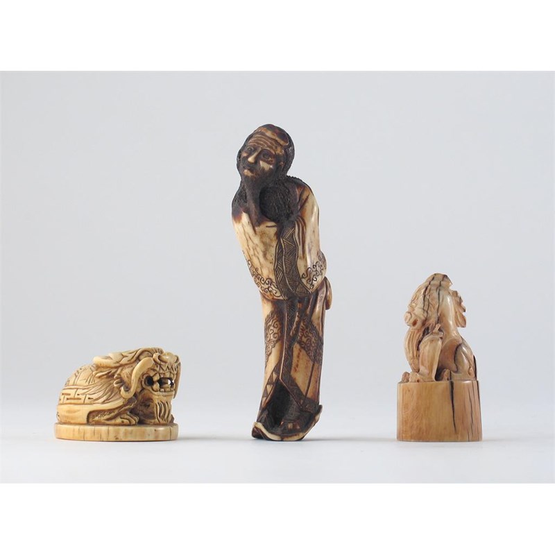 A Chinese bone carving of a standing figure, with a double gourd flask at his hip, and two Chinese ivory seals, 19th and 20th centuries, 14cm. max. (3)