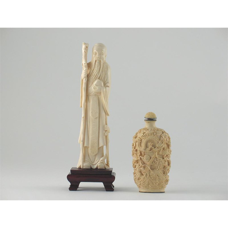 A Chinese ivory carving of Shoulao, standing holding a gnarled staff and a peach, and a resin snuff bottle, 16cm. (2)