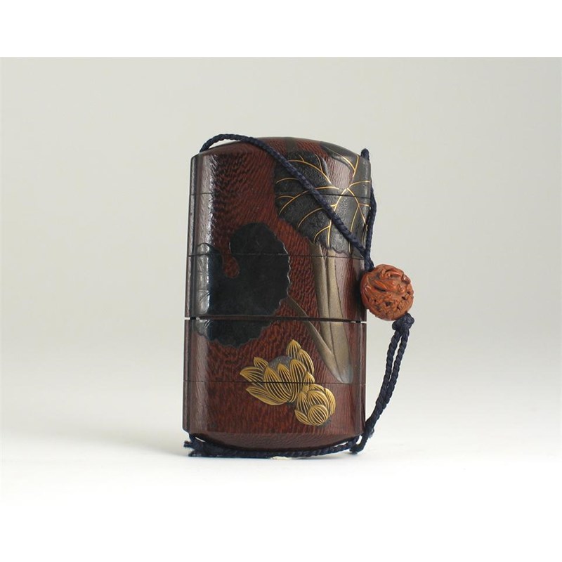 A Japanese wooden inro, decorated with lotus branches, flowers and leaves, a two character mark to one end, 19th century, 8.5cm.