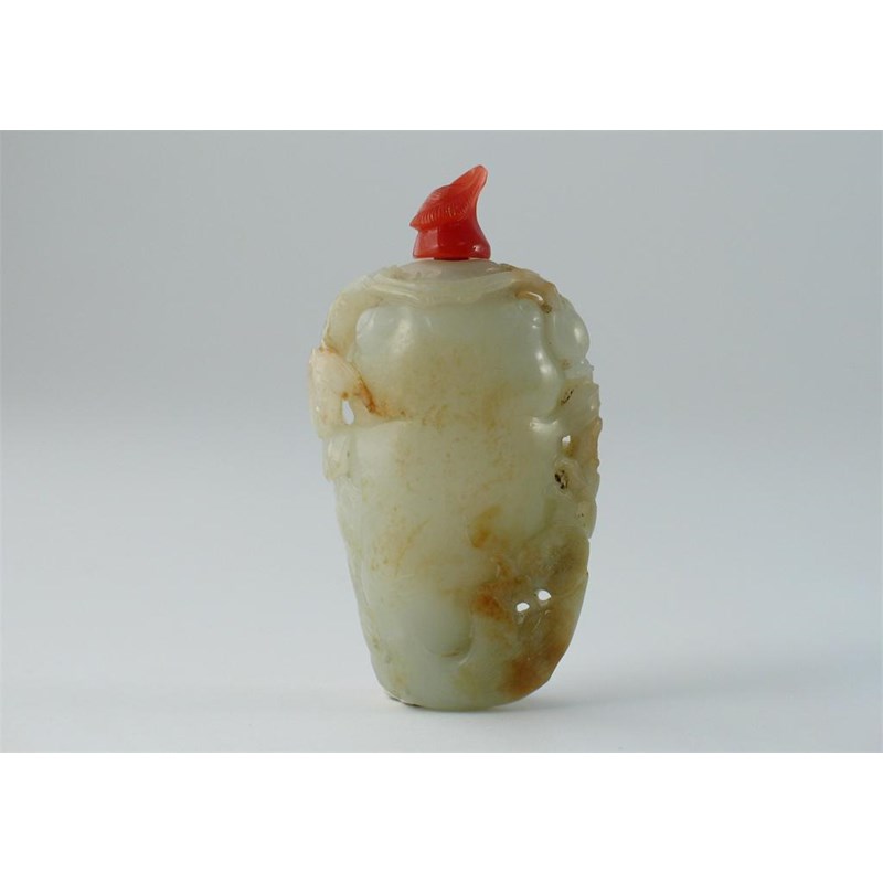 A good Chinese pale celadon jade snuff bottle, formed as a fabulous fish amidst pomegranate leaves, other leaves and scrolls, Qianlong 1736-95, 9cm. Ex. George De Menasee Collection.