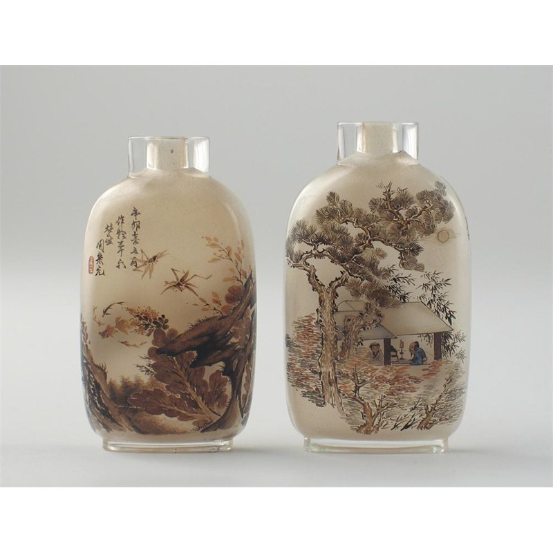 Two Chinese interior painted glass snuff bottles, both with landscapes including figures and insects, and with calligraphy, 20th century, 6.5cm. (2)