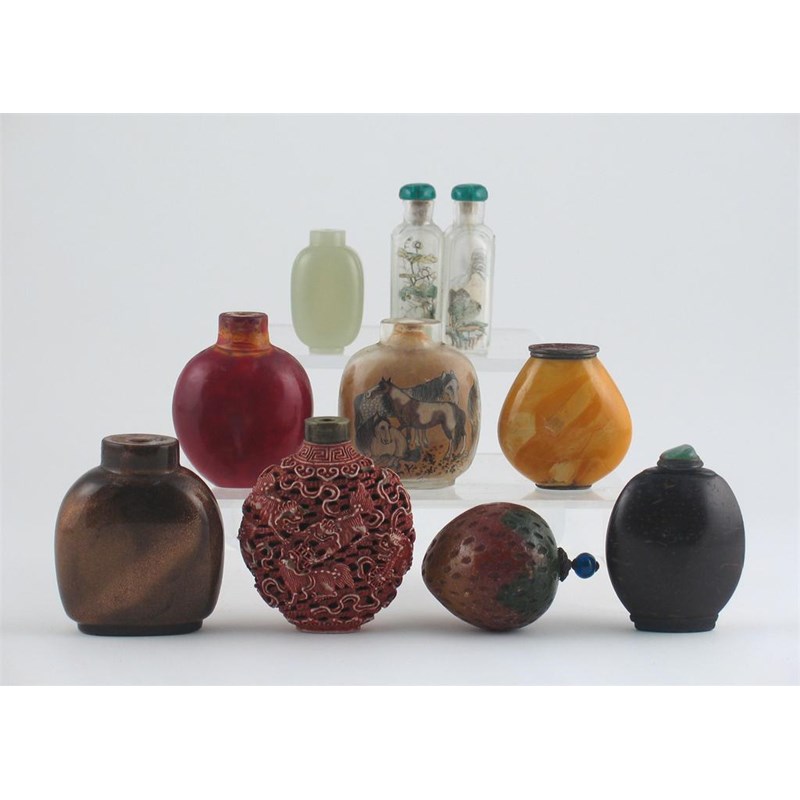 Ten Chinese snuff bottles, variously decorated with horses, lion dogs, birds and landscapes. Some damages. (10)