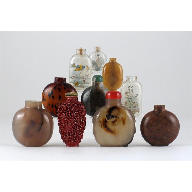 A Chinese porcelain coral red snuff bottle, moulded with a dragon and phoenix, four character Jiaqing mark, but later, and 12 other snuff bottles, 8cm. max. (13)