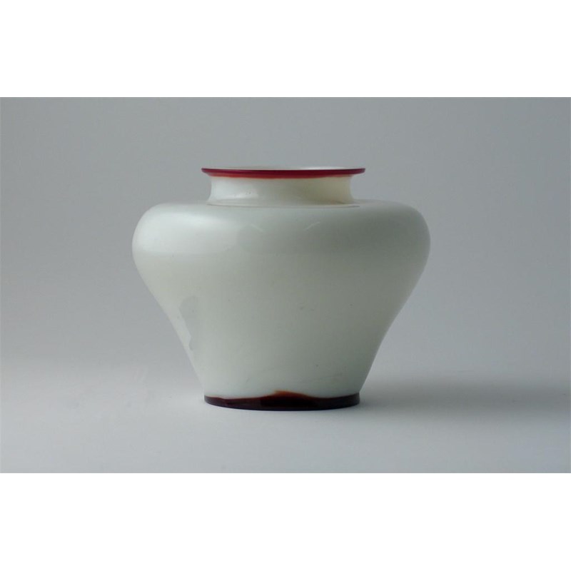 A Chinese Beijing glass compressed baluster vase, the white metal body with a claret red footrim and mouth, 19th century or earlier, 12.5cm.