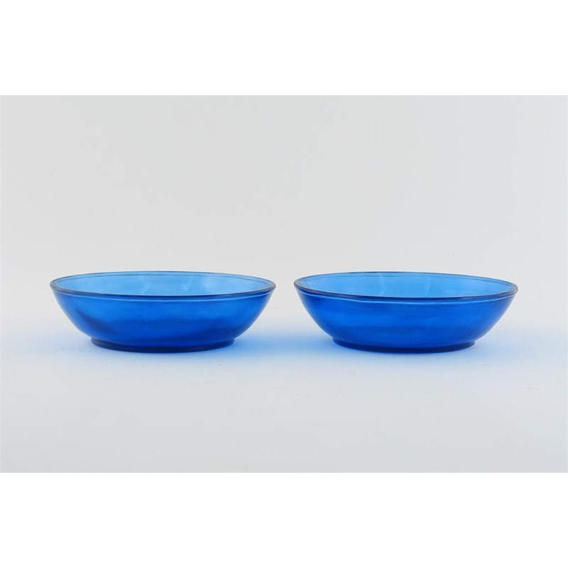 A pair of Chinese blue Beijing glass shallow bowls, each incised on the base with a four character Jiaqing mark 1796-1820 and probably of the period, 16.5cm. (2)