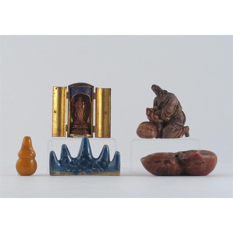 A Chinese blue glazed brush rest, moulded with auspicious symbols, a yellow hardstone snuff bottle, formed as a gourd, two soapstone carvings and a miniature travelling shrine, 18th/19th century, 11cm. max. (5)
