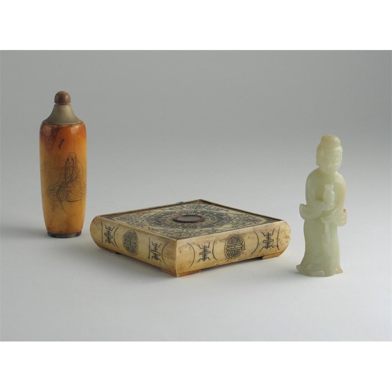 A small pale celadon jade carving of a standing lady, a bone snuff bottle engraved with two figures and a bone compass, 12.5cm. max. (3)
