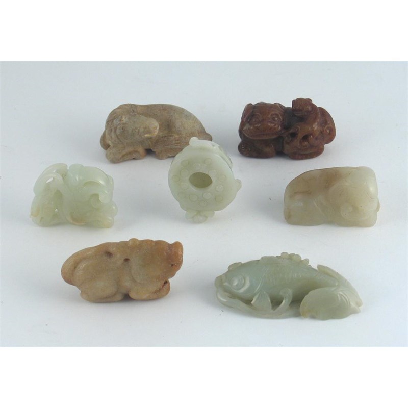 A Chinese jade carving of a lotus seed pod, another of a goldfish with an elaborate tail, and five further hardstone carvings, 19th/20th century, 7.5cm. max. (7)