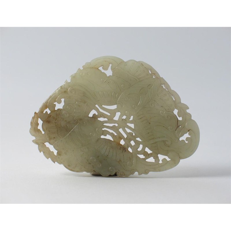 A Chinese jade belt buckle, carved with two moths, 19th century, 9cm.