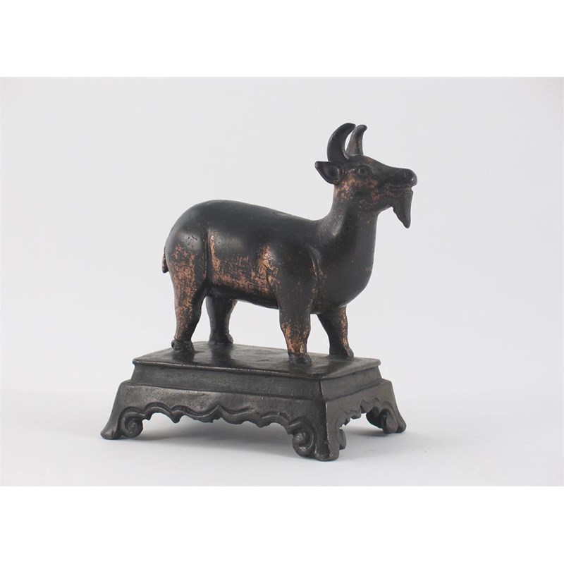 A Chinese bronze model of a billy goat, standing four square on an associated rectangular stand, traces of gilding, 18th century, 12cm. max.