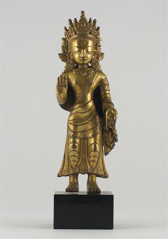 A Tibetan gilt bronze figure of Padmapani, standing, his right hand in vitarka mudra, his left hand at his side, wearing a dhoti, 17th/18th century, the mount later, 26.5cm. high.