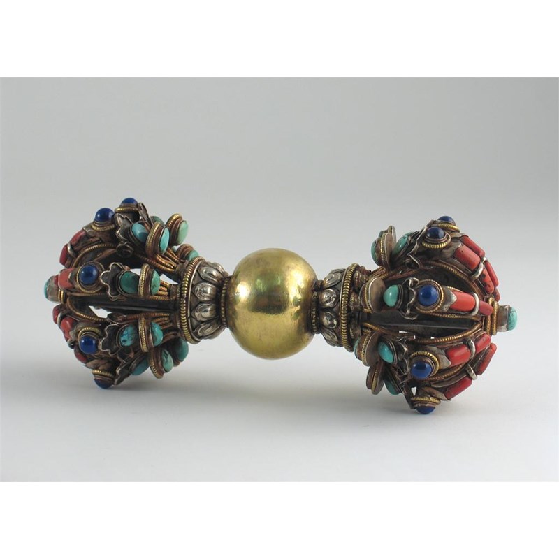 A Himilayan mixed metal vajra, inlaid with lapis lazuli, coral and turquoise, 20th century, 21cm.