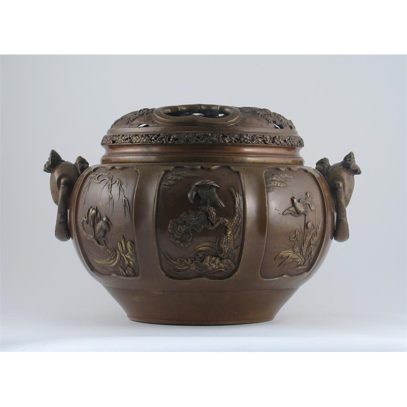 A large Japanese bronze censer, decorated with panels of water birds, amidst lotus, reeds and breaking waves, the handles as the rice god Daikoku beneath a giant bag of rice, the reticulated lid with sages beneath a pine tree, a six character inscription to the base, 19th century, 43cm.