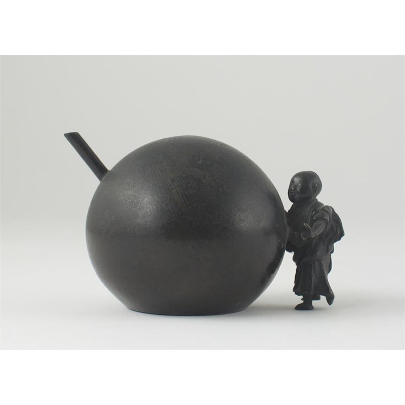 A Japanese bronze water dropper, cast as a little boy pushing a giant ball, 19th century, 7cm.