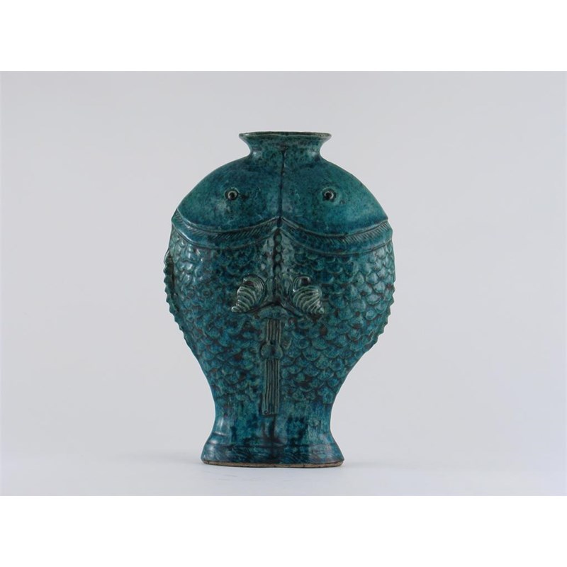 A Chinese moulded twin-fish vase, each carp with well defined scales and open mouth. Base drilled. 18th/19th century, 26cm.