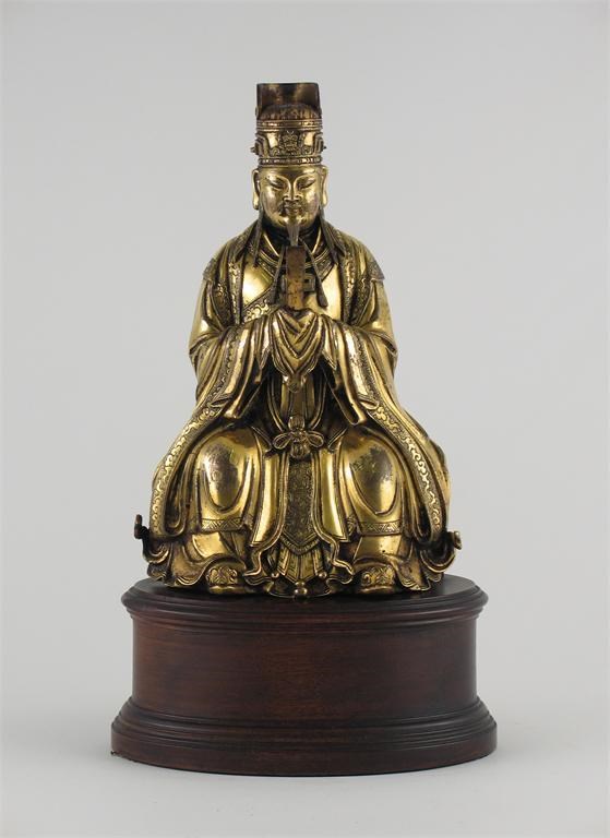 A rare Ming dynasty gilt bronze figure of Wen Ch'ang, the god of literature, seated wearing elaborate robes with cloud scroll borders, a scholarly headdress and holding a sceptre. 16th/17th century, 23.5cm. Raised on a hardwood stand. (2) Cf. Wen Ch'ang was born during the Tang dynasty (618-906 AD) in the Kingdom of Ye?h. He was a brilliant writer and was canonised by the Tang rulers.