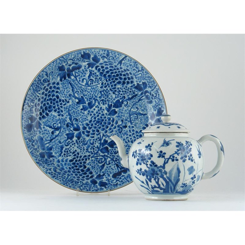A Chinese blue and white saucer dish, decorated with a peony, and a blue and white punch pot painted with birds and insects above a peony tree. The punch pot damaged. Both Kangxi 1662-1722, 35.5cm. (3)