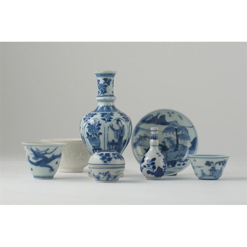 Two Chinese blue and white vases, a box and cover from the Vung Tau Cargo, a cup from the Hatcher Cargo and a white glazed bowl also from the Vung Tau. Damages. 17th/18th century. (8)