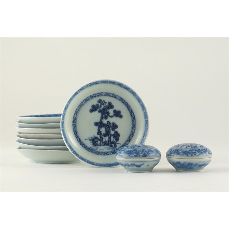 Eight Chinese blue and white saucers, from the Nanking Cargo, painted with pine trees, and two circular boxes and covers, from the Hatcher Collection. Some damages. 17th and 18th centuries, 10.2cm. (12)