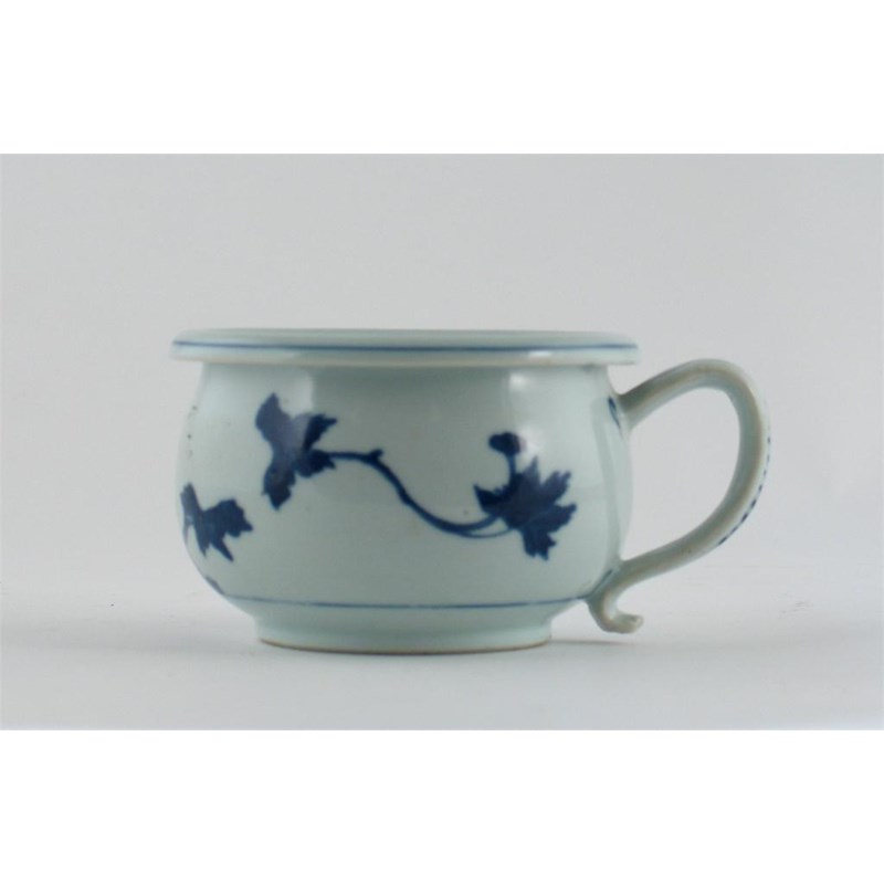 A Chinese chamber pot from the Nanking Cargo, painted in blue with a trailing vine, c.1750, 15.5cm. Christie's Nanking Cargo label.