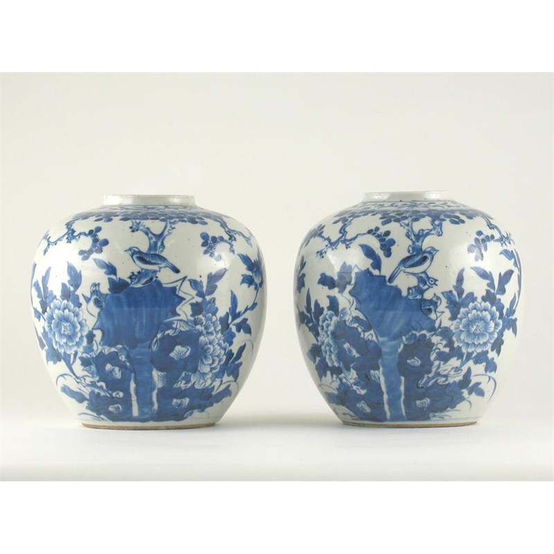 A pair of Chinese blue and white ovoid vases, decorated with birds perched on rockwork from which peonies grow, c.1900, 17cm. (2)
