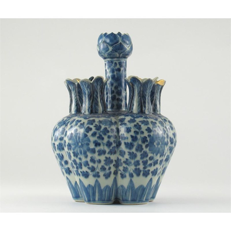 A Chinese blue and white tulip vase, decorated with scrolling chrysanthemum. Damage to the neck. 19th century, 24.5cm.