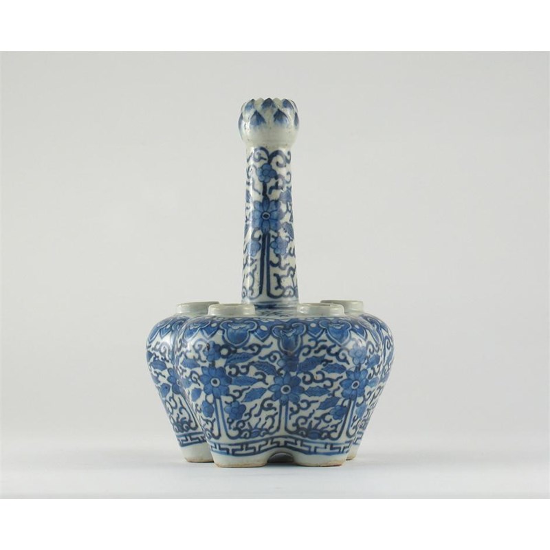 A Chinese blue and white vase, with a tall central neck with five apertures to the lobed body, 19th century, 24.5cm.