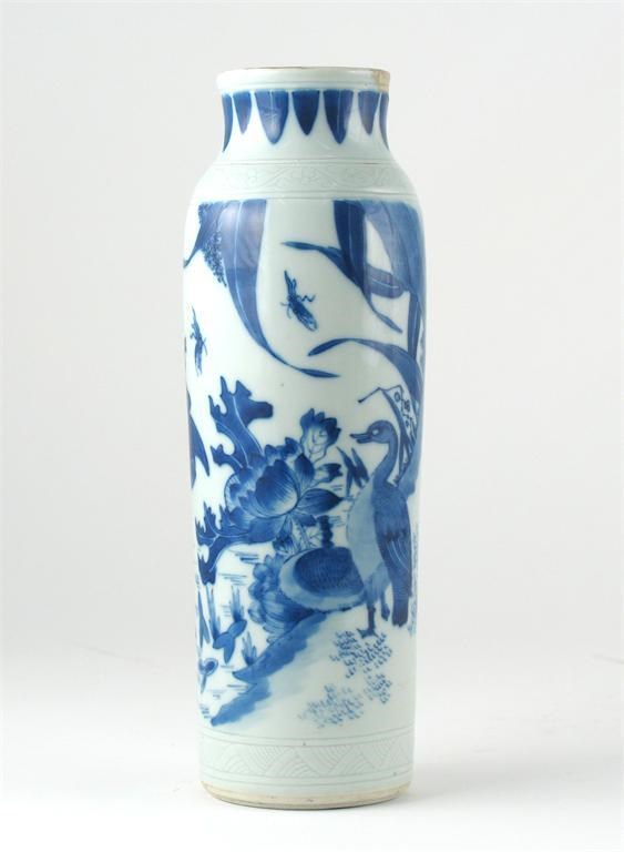 A Chinese Transitional-style blue and white sleeve vase, painted with two ducks and a woodcock amidst lotus, the shoulder and foot with incised bands. The rim with a firing fault and small chip. 27cm.