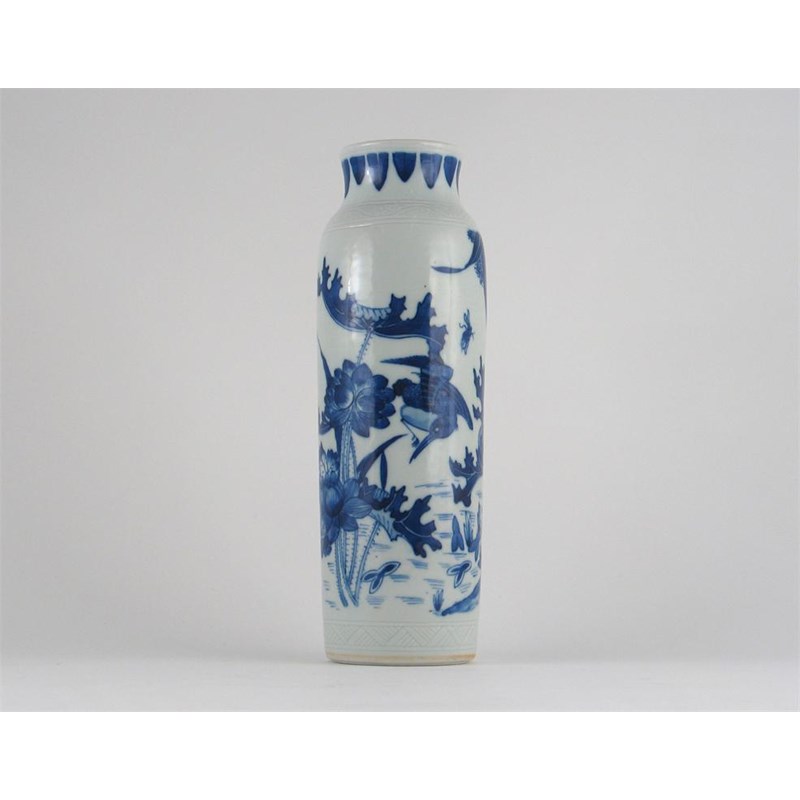 A Chinese blue and white Transitional-style sleeve vase, painted with aquatic birds amidst lotus, between anhua bands, 27cm.