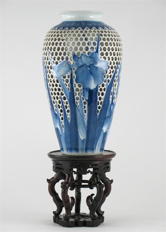 A Japanese reticulated vase, with a central solid cylinder, painted in blue with irises, six character mark, early 20th century, 26.5cm. Together with a wood stand. (2) Provenance: Gifted to a British diplomat stationed in Peking c.1900 and thence by descent.
