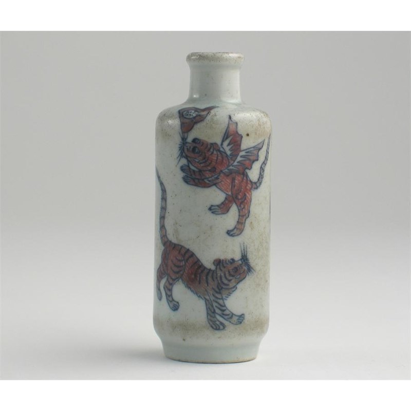A Chinese cylindrical snuff bottle, decorated with five tigers, one winged and holding a flag in its jaws, the base with a sixth striped beast, 19th century, 8cm.