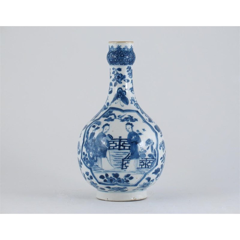 A Chinese blue and white guglet with a hua shih glaze, decorated with panels of figures, flowers and butterflies, 18th century, 24cm.